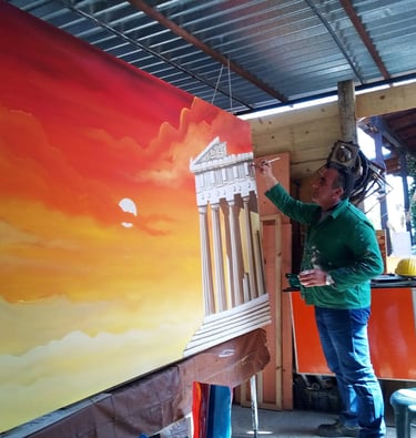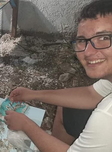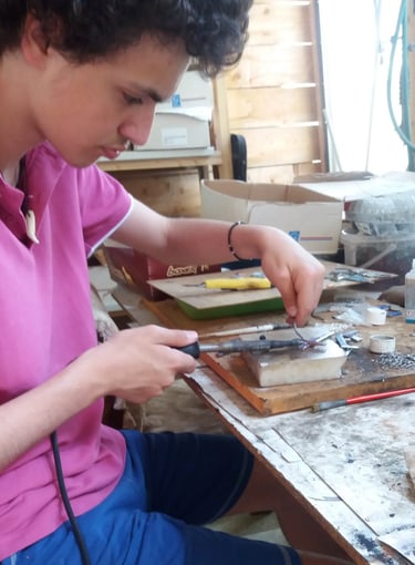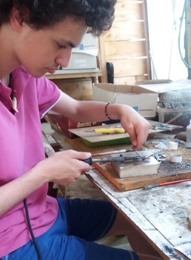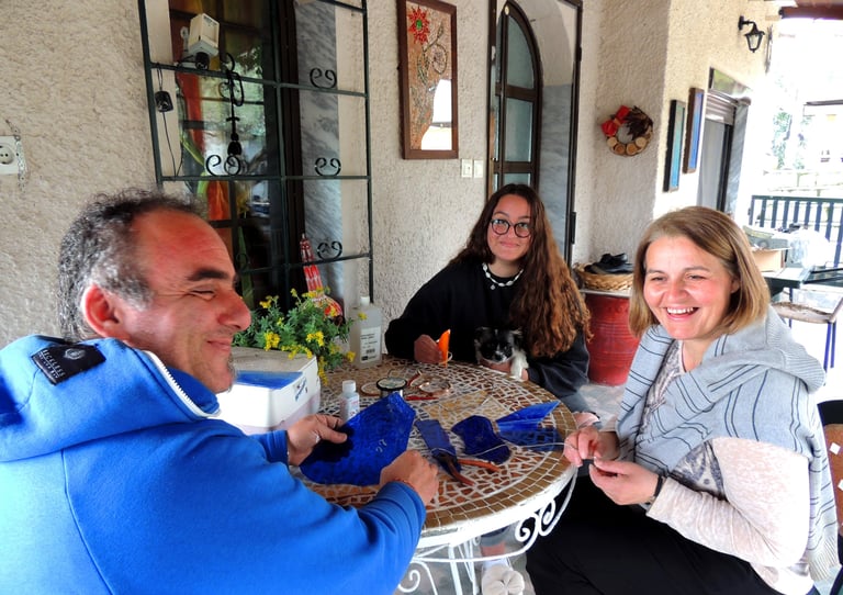 He teaches painting, stained glass fusing, and hagiography in clubs, schools, and groups, sharing his knowledge of the arts with everyone. His family is a supporter and valuable help in all these actions.