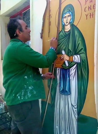 He is professionally involved in Painting, Stained Glass Fusing, and Iconography.